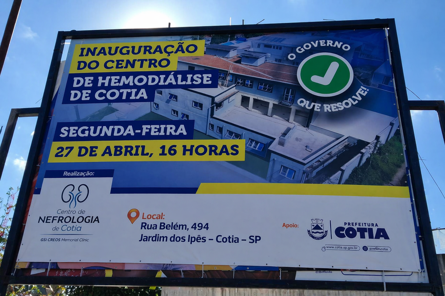 Banner informa a inauguração do Centro de Hemodiálise de Cotia, prevista para o dia 27 de abril, com objetivo de ampliar o atendimento a pacientes com doenças renais no município.